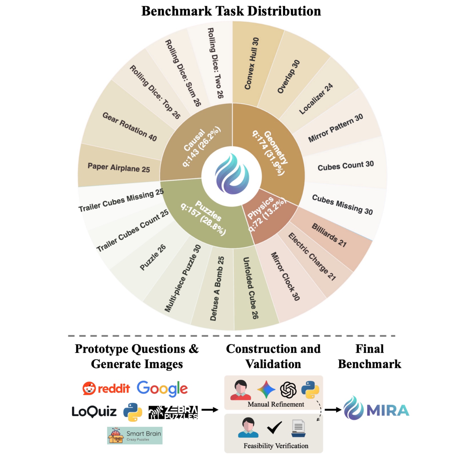 MIRA is a benchmark that evaluates models on tasks requiring intermediate visual generation for reasoning. It contains 546 annotated multimodal problems and a unified evaluation protocol. Models improve by 33.7% on average when given intermediate visual cues, showing their importance for reasoning.